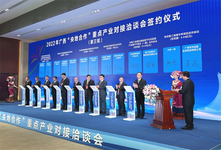 9月16日下午,廣西壯族自治區與中央企業2022年“央地合作”重點產業合作洽談會在南寧舉行,城投集團黨委書記、董事長黃俊參加會議并代表賀州市屬國有企業與中央企業簽約。